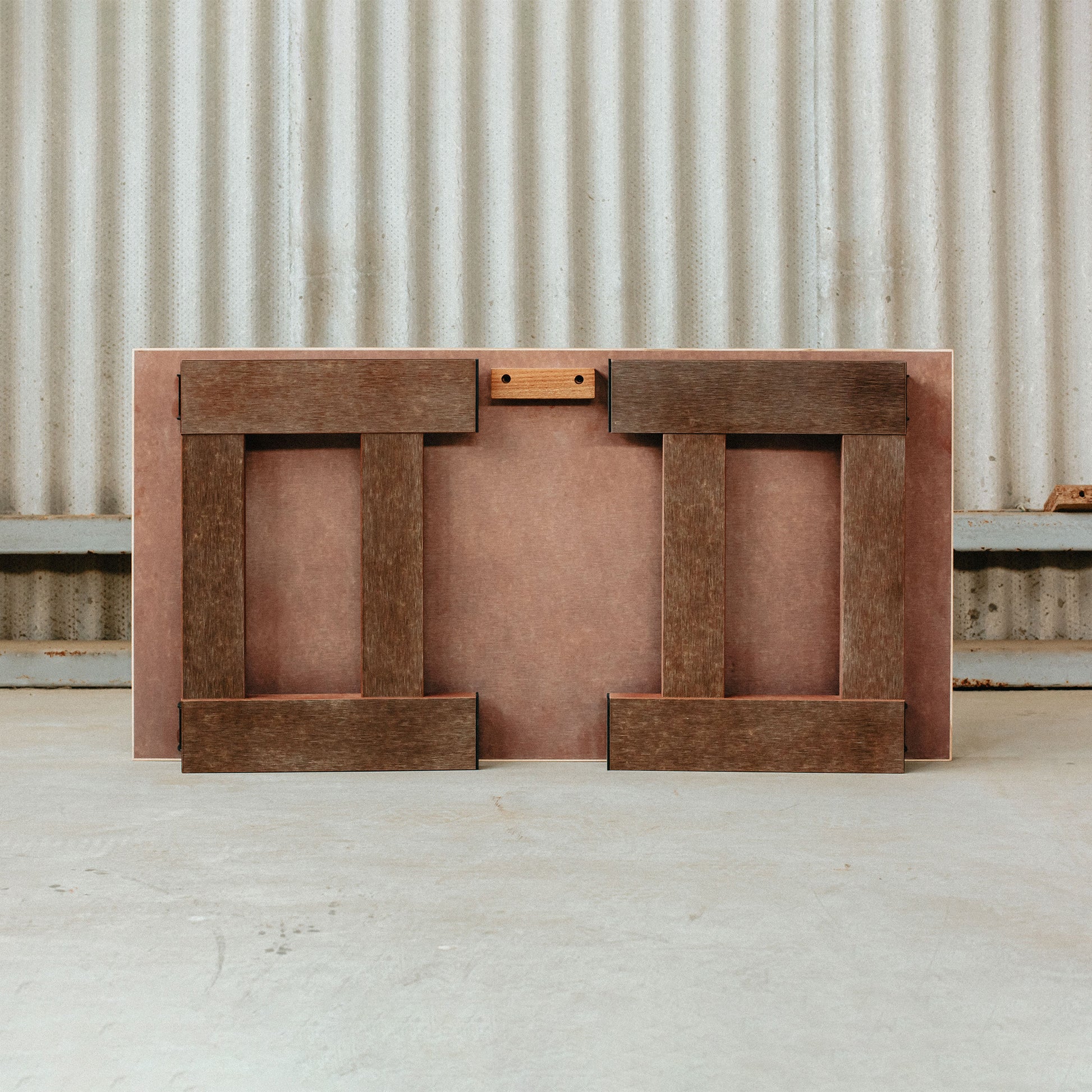 テーブルの表面と小口は無垢材(表面の木目に沿った中央部はエポキシ樹脂、裏面はメラミン使用)