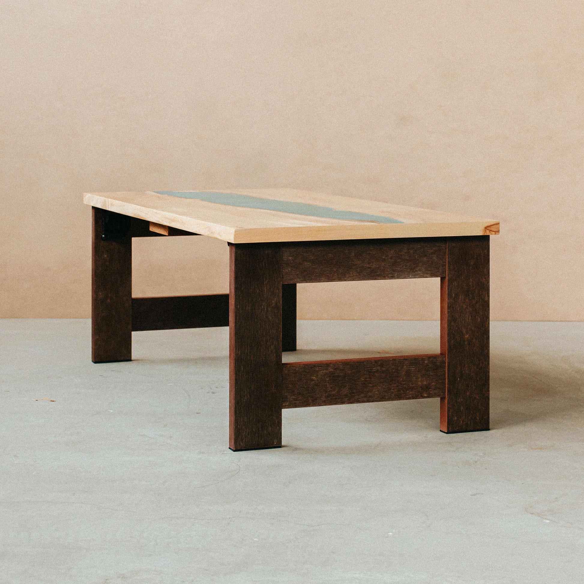 美しい木目の無垢材とレジンを組み合わせた、おしゃれで個性的なローテーブルです。
