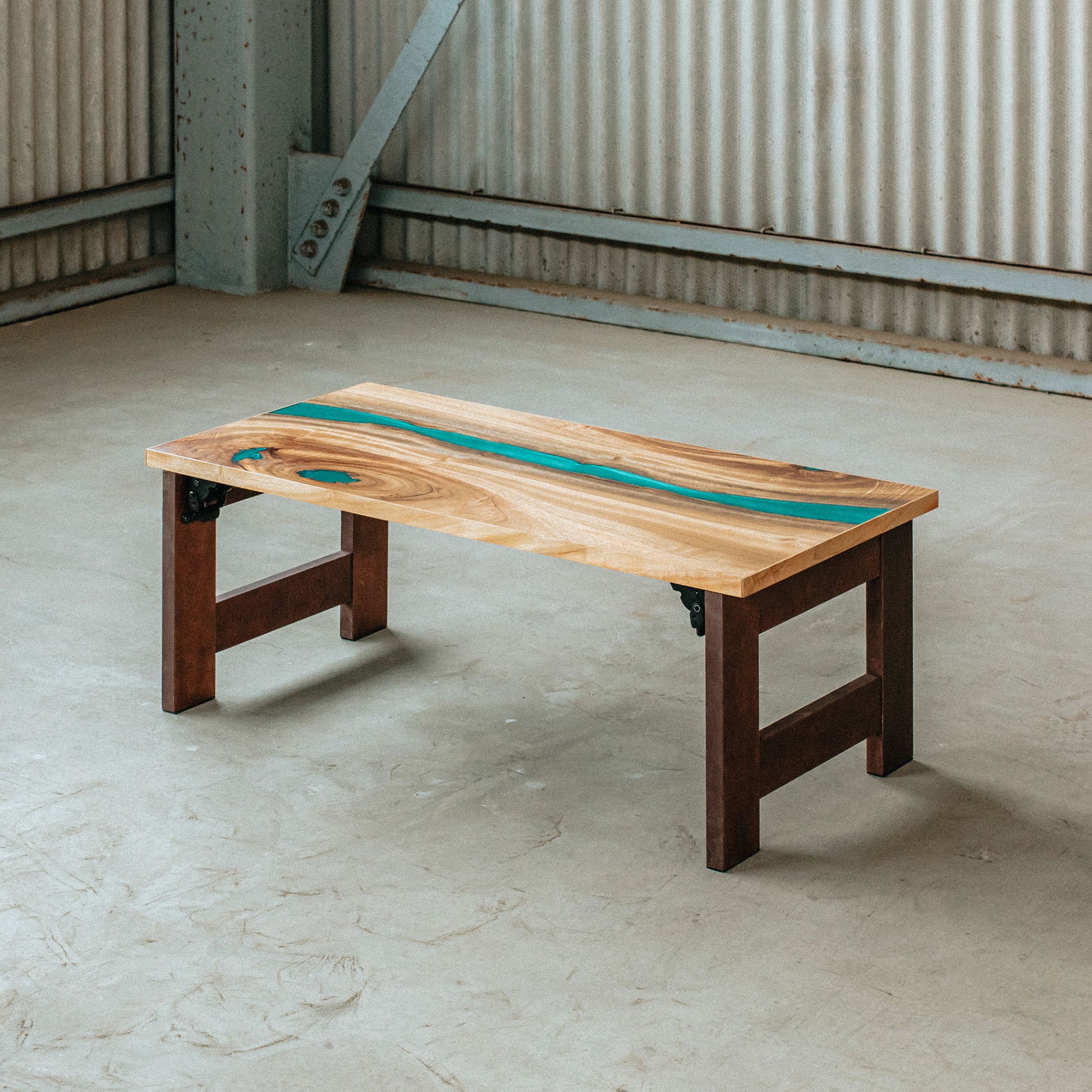 美しい木目の無垢材とレジンを組み合わせた、おしゃれで個性的なローテーブルです。