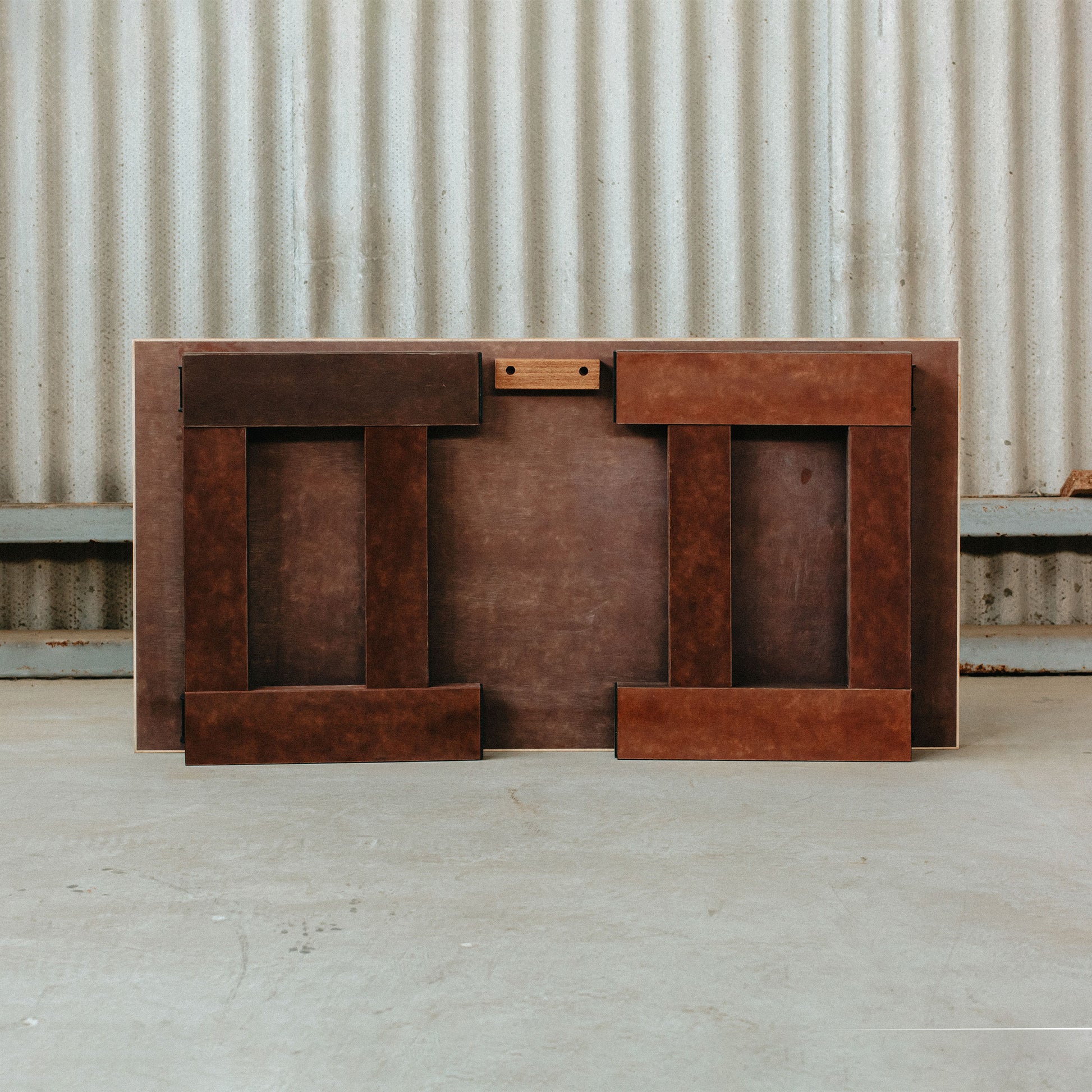 テーブルの表面と小口は無垢材(表面の木目に沿った中央部はエポキシ樹脂、裏面はメラミン使用)